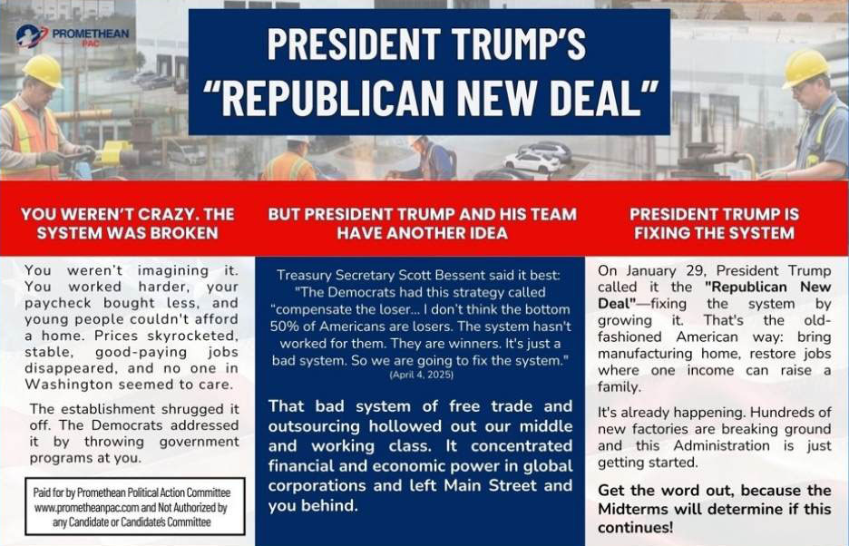 President Trump called it the "Republican New Deal" — fixing the system by growing it. Not government handouts, not "compensate the loser" programs. Real production, real jobs, real investment flowing back into American communities.